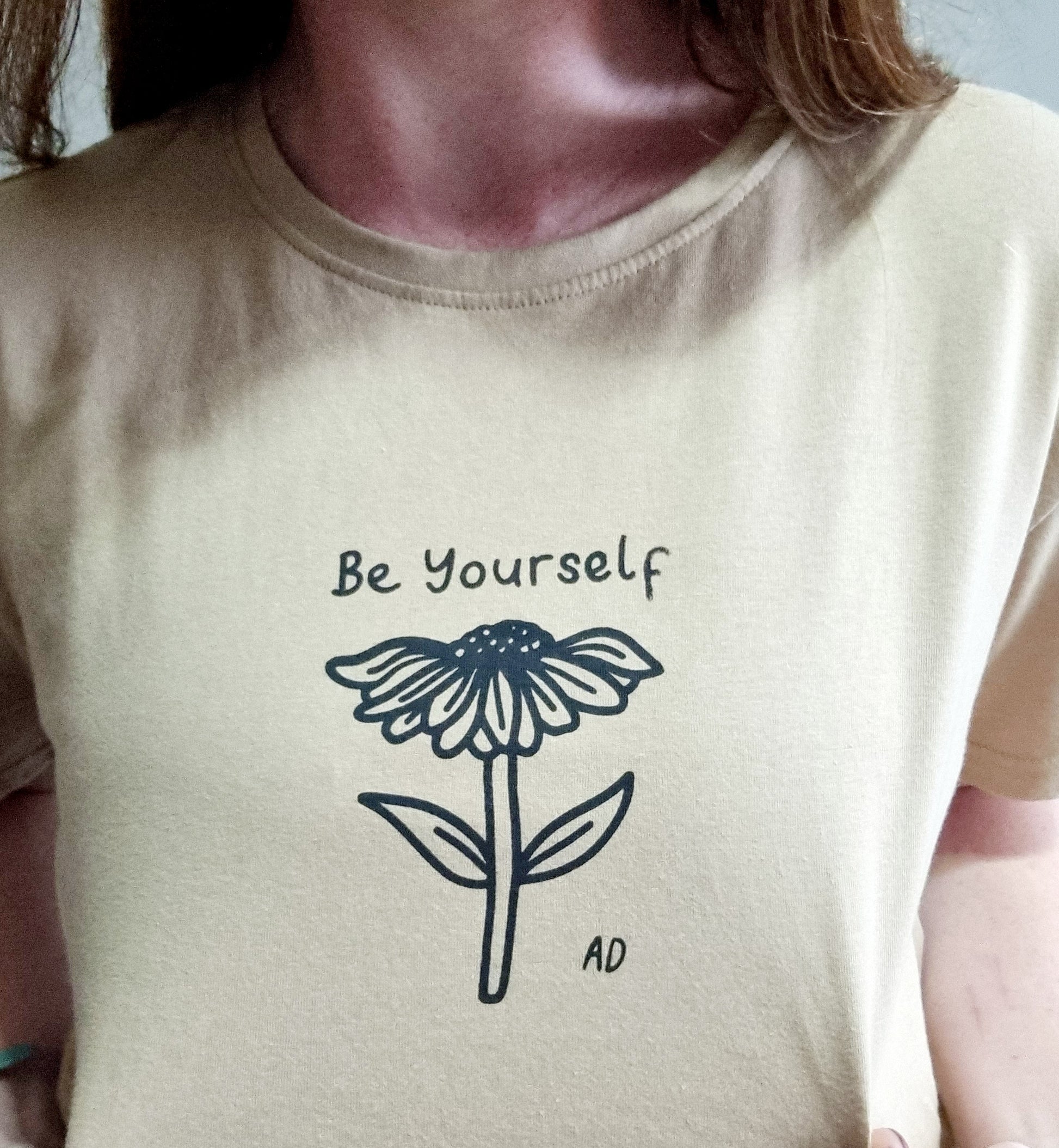 Our last t-shirt in the colour Sand Dune, with our most popular design - Be Yourself Floral Design.