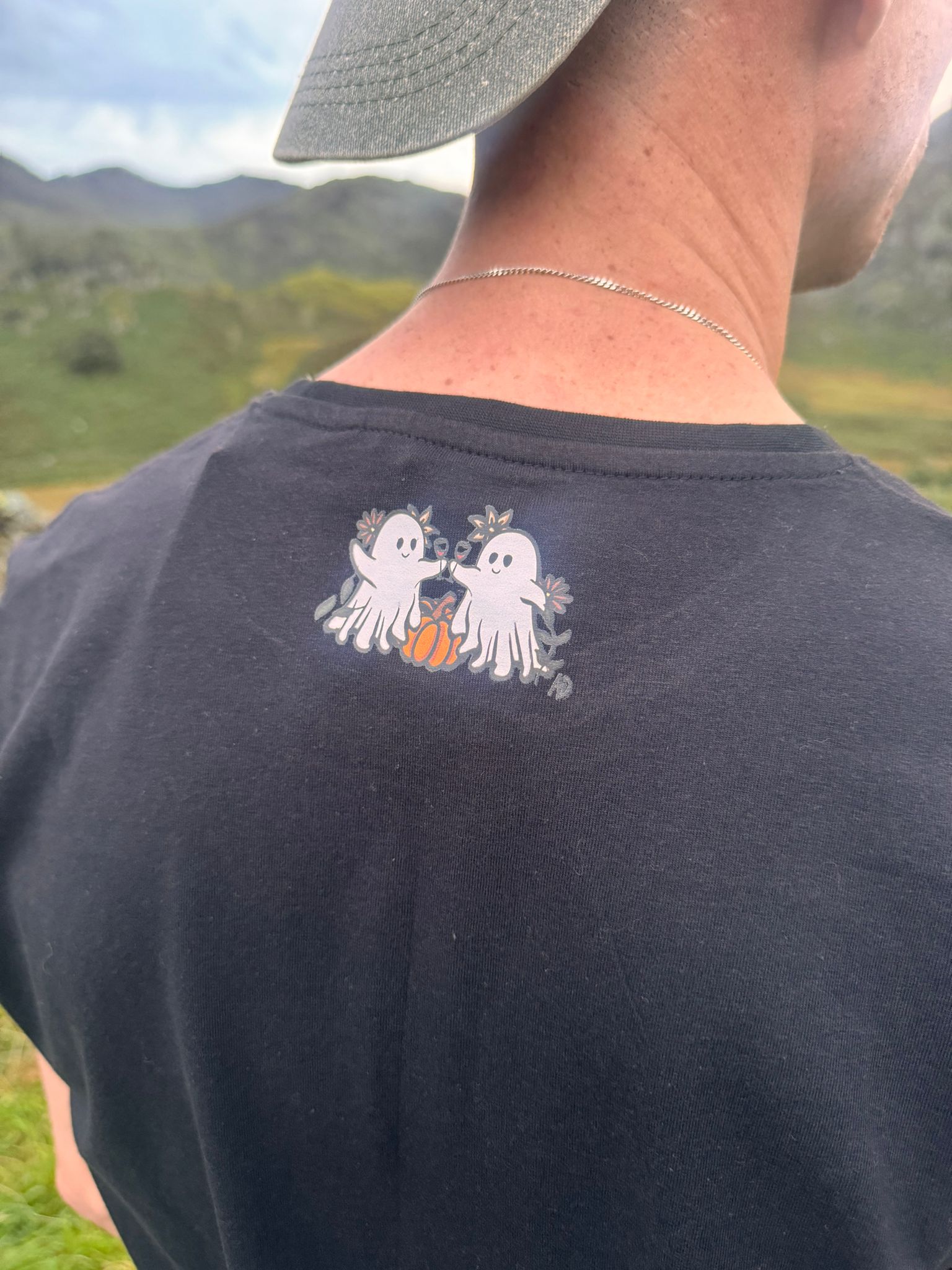 Spooky Ghosty Black Organic T-Shirt (Dance Like Nobody Is Watching- Dancing Skelentons)